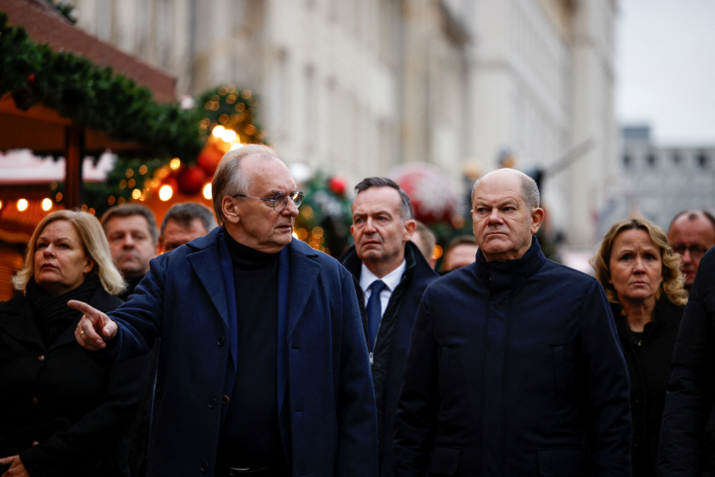 O chaceler alemão, Olaf Scholz (à dir.), visita a feira de Natal de Magdeburg, no sul da Alemanha, que um motorista invadiu, matando e ferindo várias pessoas, em 21 de dezembro de 2024. — Foto: Axel Schmidt/ Reuters