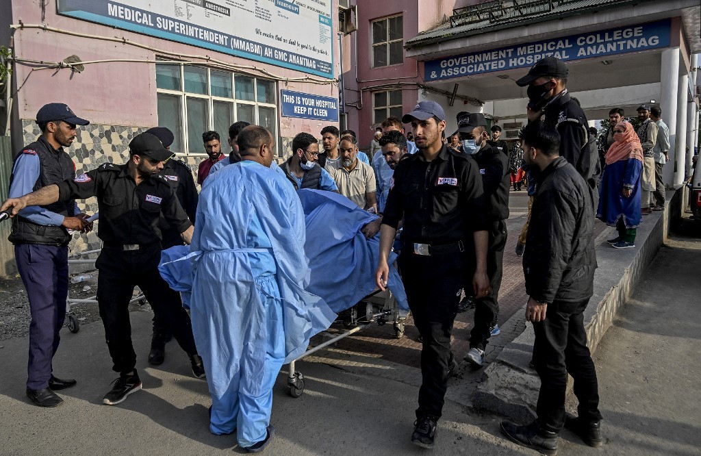 Primeiro-ministro indiano, Narendra Modi, chamou ataque de ‘ato hediondo’. Ainda não se sabe as nacionalidades dos turistas que estavam no ataque. Paramédicos e policiais carregam turista ferido para hospital em Anantnag após ataque contra turistas em 22 de abril de 2025.