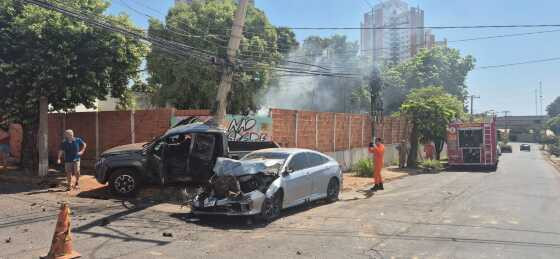 Quatro pessoas ficaram feridas, na manhã deste domingo (17), em um acidente de trânsito envolvendo um Civic e uma Amarok na Avenida Estevão de Mendonça, no bairro Quilombo, em Cuiabá. Segundo o Corpo de Bombeiros, o impacto da colisão foi tanto que provocou a queda de um poste de energia, que resultou em um incêndio nas proximidades do ocorrido.