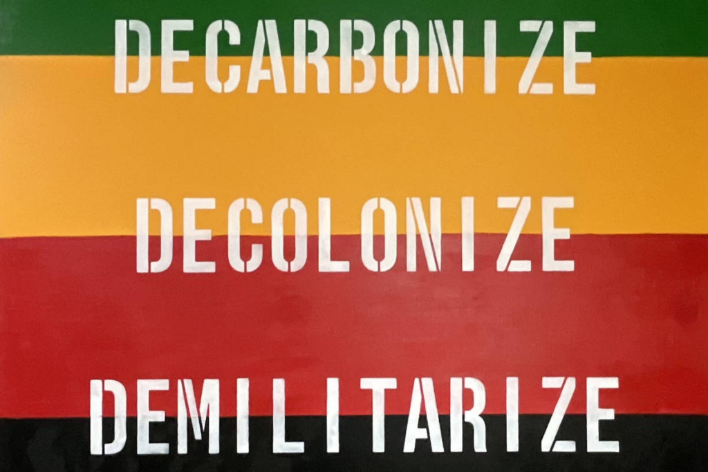Basta estar no parque Ibirapuera para ver, já do lado de fora do pavilhão da Bienal de São Paulo, a mensagem do artista Olu Oguibe, que pede em letras maiúsculas a desmilitarização, a descolonização e também a descarbonização da cultura e da economia, uma mensagem de força e paz em tempos de derretimento das nossas esperanças mundo afora.