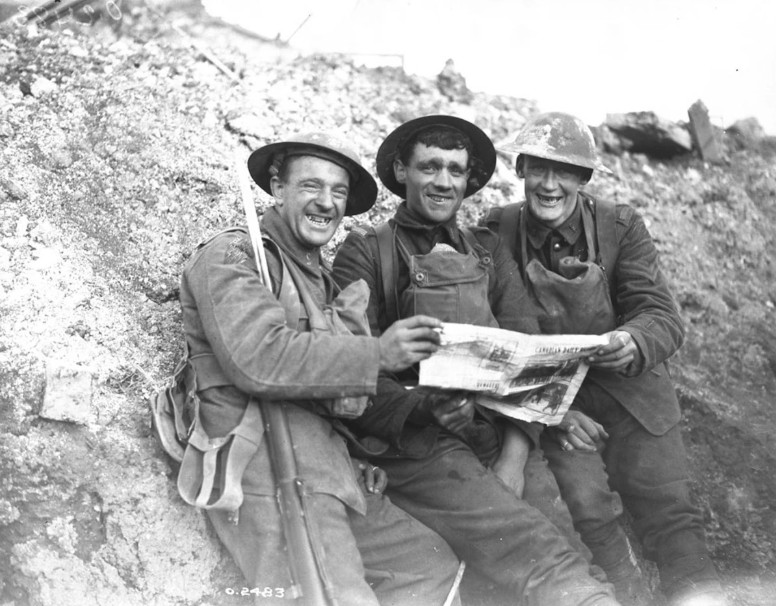 Três soldados canadenses são flagrados lendo jornal e sorriem para a foto. 21 de Fevereiro de 1918, em Lens.