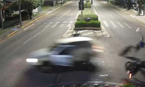 Câmeras de segurança registraram o momento em que uma motocicleta é atingida por um Gol. O acidente ocorreu na rotatória entre as avenidas Brasil e Imigrante, em Sorriso (a 397 km de Cuiabá), na madrugada de domingo (29).