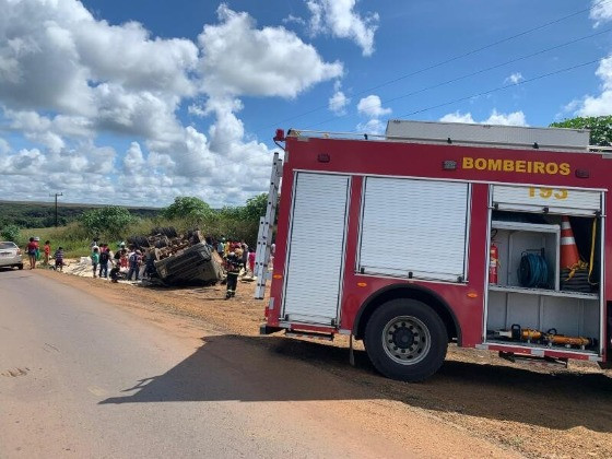 O caminhão estava carregado de arroz e parte da carga foi saqueada por moradores da região.