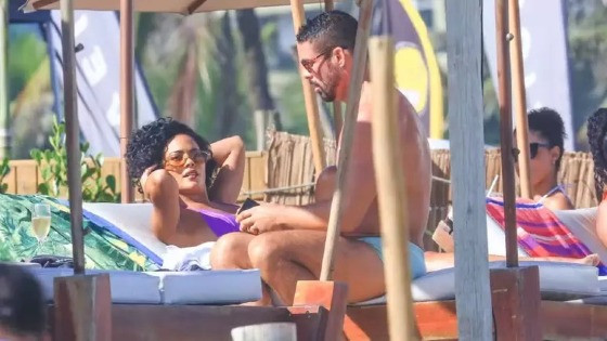 Paz selada? Cauã e Bella surgem juntos na praia gravando ‘Vale Tudo’ após polêmica nos bastidores.