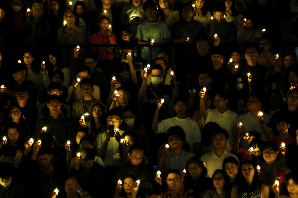 Fiéis seguram velas elétricas durante uma missa de Natal na Indonesia Arena, em Jacarta, na Indonésia.