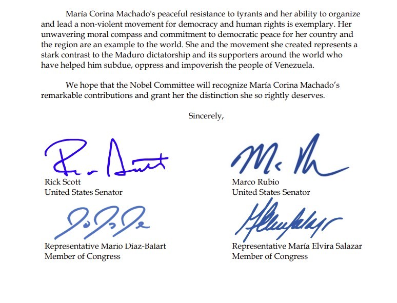 No documento, disponível no site do senador Rick Scott, os parlamentares descrevem a política venezuelana como uma “figura de coragem e moralidade” e pedem ao comitê que reconheça “seu compromisso incansável com a restauração da democracia e dos direitos humanos na Venezuela”.