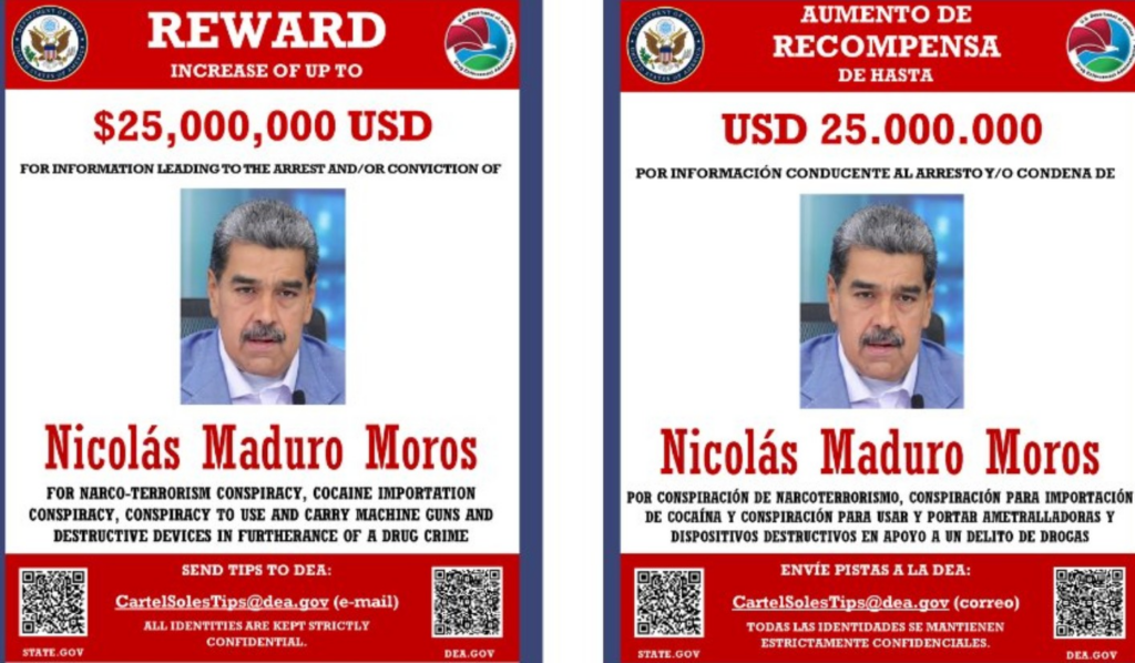 Segundo a imagem, Maduro é acusado de “conspiração com o narco-terrorismo, com a importação de cocaína, com o uso e transporte de armas e objetos destruidores em fomento a um crime de tráfico de drogas”.