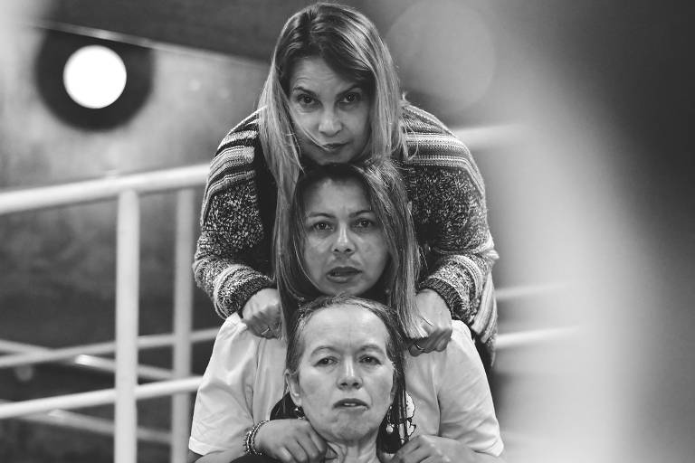 A imagem em preto e branco mostra três mulheres em uma formação vertical. A mulher na parte superior está com as mãos nos ombros da mulher do meio, que, por sua vez, está olhando para a câmera. A mulher na parte inferior está com uma expressão neutra e usa uma camiseta com a frase 'self'. O fundo é desfocado, com uma estrutura que parece ser uma escada e uma luz circular visível.