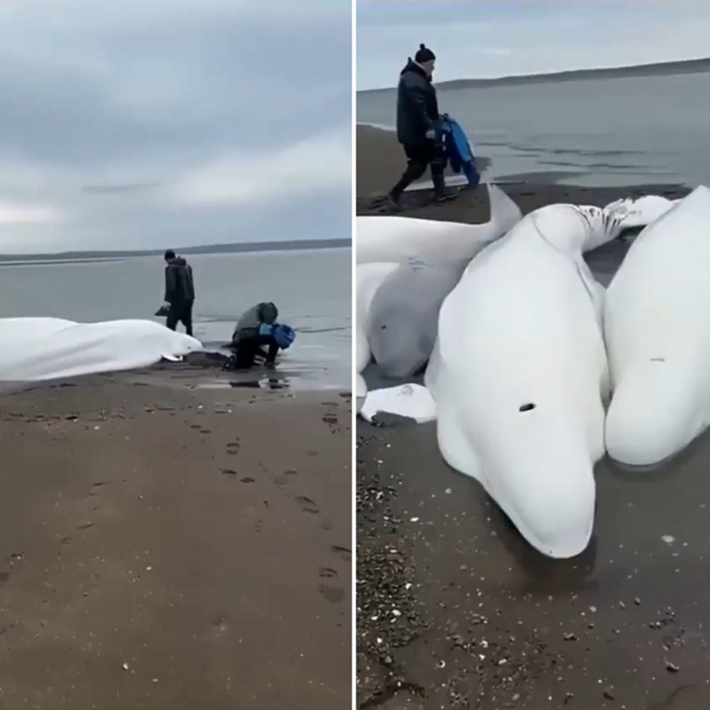 O vídeo compartilhado exibe quatro belugas adultas e um filhote encalhados na faixa de areia de uma praia. Na cena, dois homens tentam ajudar os animais, jogando baldes com água.