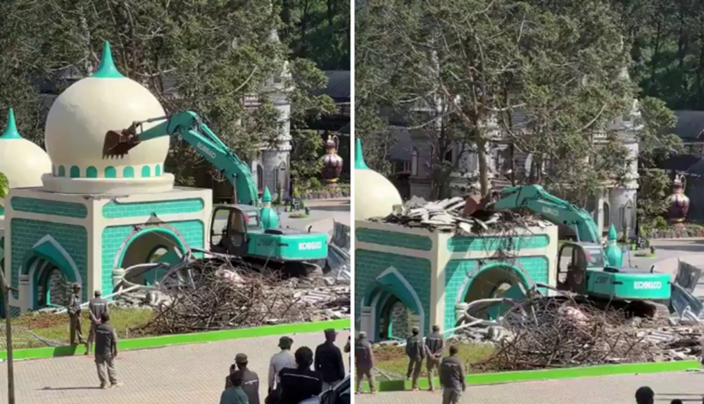 A gravação mostra uma construção verde-água com um domo branco, similar a uma mesquita, sendo demolida por uma escavadeira.
