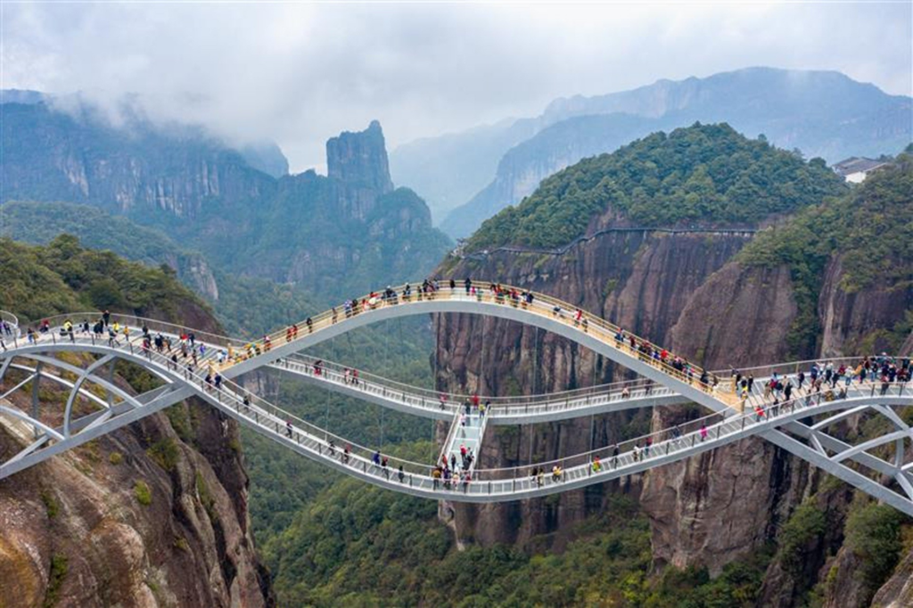 Inaugurada em setembro 2020, a construção chama atenção por sua estrutura inusitada, que parece desafiar a gravidade: são três passarelas onduladas, com pisos de vidro, que interligam duas montanhas, a uma altura de 140 metros, no vale Shenxianju.