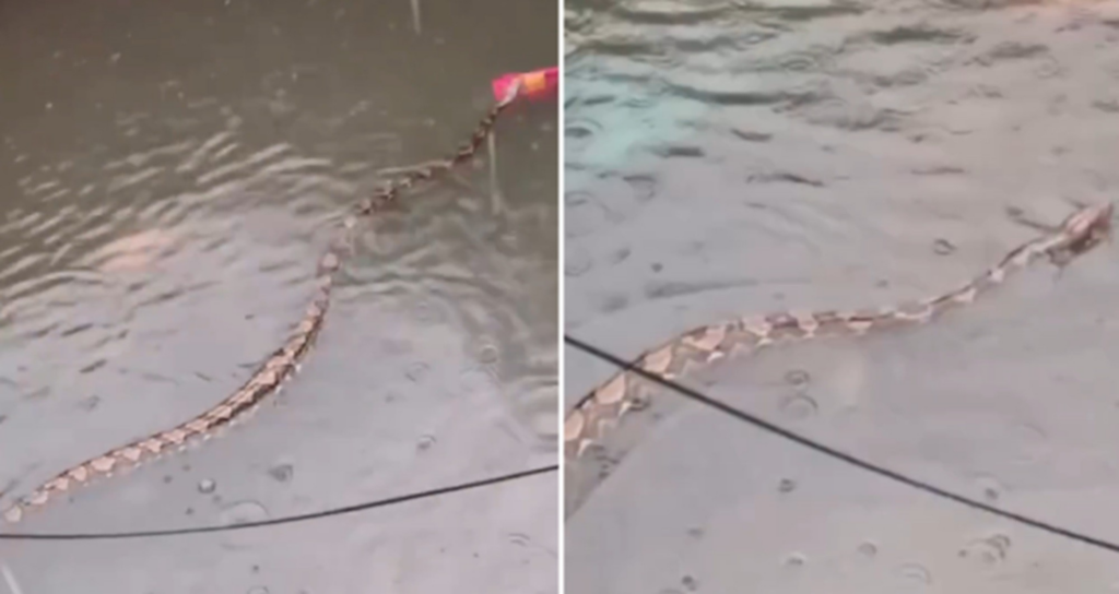 No registro, uma cobra gigante aparece nadando em uma rua residencial completamente alagada. Da varanda de uma casa, o homem que filma a cena começa a gritar, em indonésio: “A Píton é enorme! Não entre na nossa casa. É uma cobra enorme. Cuidado, cuidado, cobra grande!”.