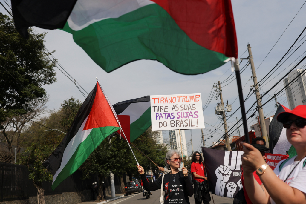 Manifestantes pro-Palestina durante ato em frente ao Consulado dos EUA em São Paulo, em 19 de agosto de 2025