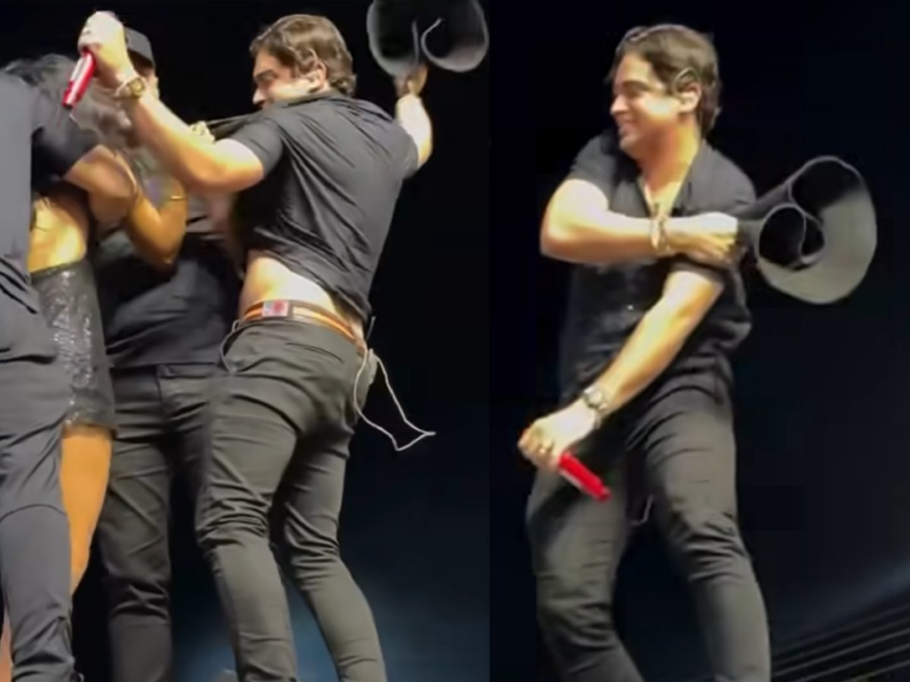 “Você está me machucado, mulher. Pera aí”, disparou ele. Em seguida, três seguranças agiram rapidamente e conseguiram afastar a mulher do cantor. Ela foi levada para fora do palco.