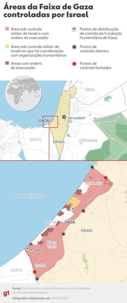 🪖 A ocupação da Cidade de Gaza é parte da estratégia militar mais ampla de Israel contra o Hamas, especialmente após os ataques de 7 de outubro de 2023, que marcaram o início da guerra atual. Desde então, Israel passou a controlar áreas na Faixa. O mapa abaixo mostra a área controlada pelo país na região.
