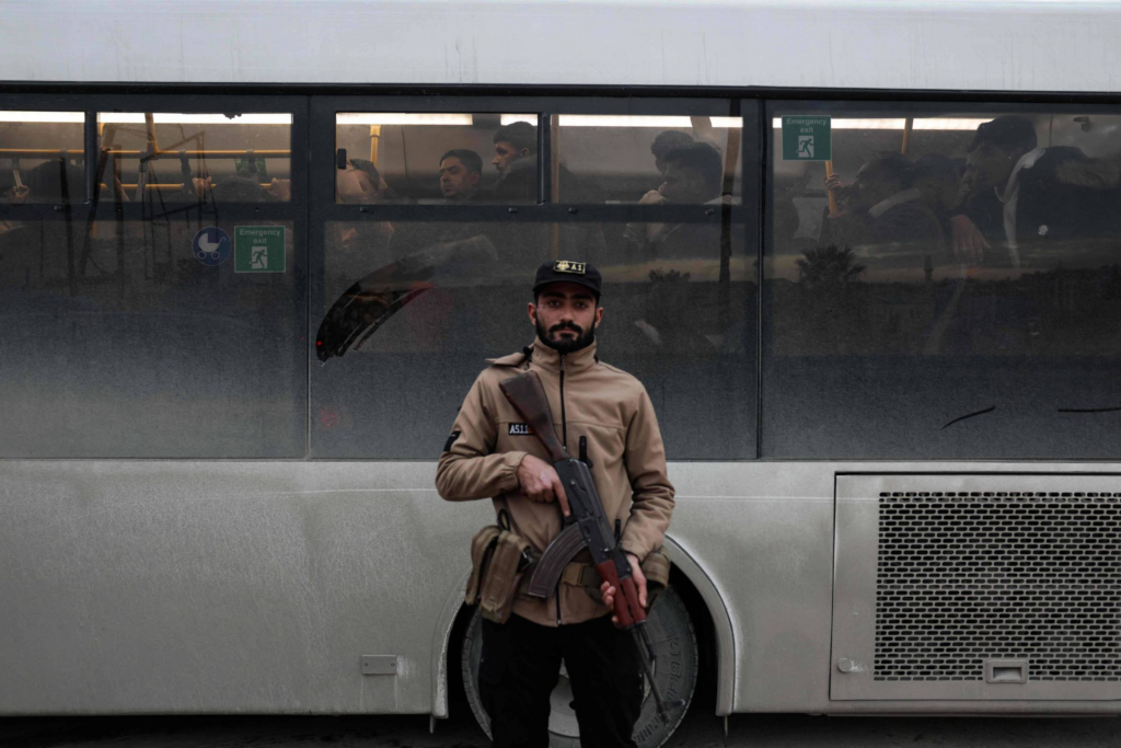 Um correspondente da AFP viu pelo menos quatro ônibus verdes com combatentes a bordo escoltados pelas forças de segurança.
