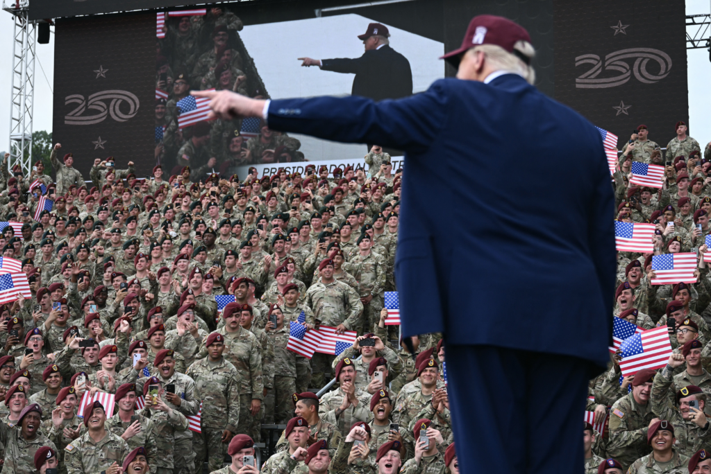 Presidente dos EUA, Donald Trump, discursa para soldados do Exército americano em Fort Bragg. Foto de 10 de junho de 2025.