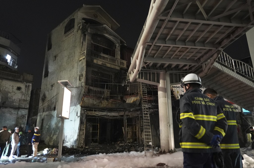 Crime teria sido provocado após desavença de cliente com funcionários. Suspeito teria despejado gasolina no chão, acendido o fogo e bloqueado a saída. Ele foi preso em seguida. Bombeiros observam prédio incendiado em Hanói, no Vietnã