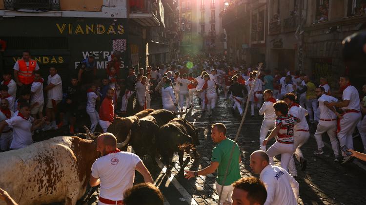 Nos “encierros” do festival, ou corridas de touros, os touros de briga são soltos nas ruas e correm para chegar à arena da tourada. Centenas de aficionados, muitos vestindo as tradicionais camisas brancas com lenços vermelhos, correm com eles.