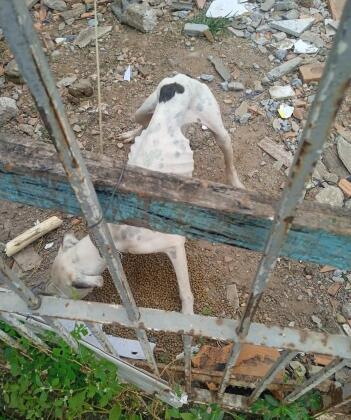 No local, os investigadores encontraram dois cachorros, sendo uma cadela de porte médio que estava amarrada em uma pequena corda, sem acesso à alimentação e água, apresentando estado de magreza extrema e infestação por parasitas.