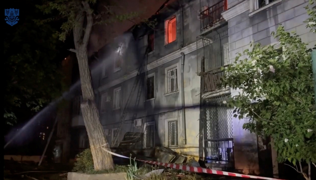 Bombeiros jogam água em prédio após um ataque de drone russo em Odesa, na Ucrânia no domingo (1)