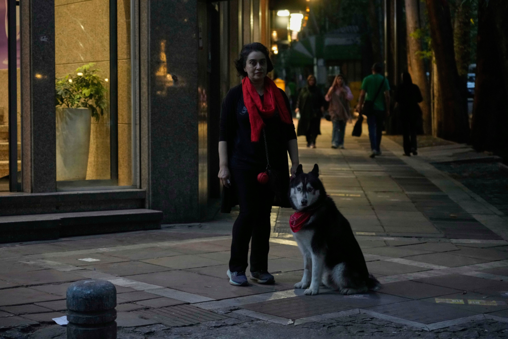Muitos religiosos consideram o contato com cachorros como algo impuro. Além disso, autoridades mais conservadoras enxergam os pets como uma representação da influência cultural do Ocidente. Uma mulher com seu cachorro em uma calçada no norte de Teerã, Irã, em 2 de junho de 2025