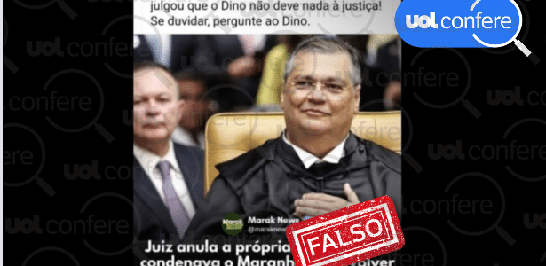A foto do ministro do STF Flávio Dino é compartilhada com a seguinte legenda “O Dino absolveu o Dino porque o Dino julgou que o Dino não deve nada à justiça! Se duvidar, pergunte ao Dino”. A frase está acima de um recorte de notícia em que se lê: “Juiz anula a própria sentença que condenava o Maranhão a devolver 141 milhões no governo Flávio Dino”.