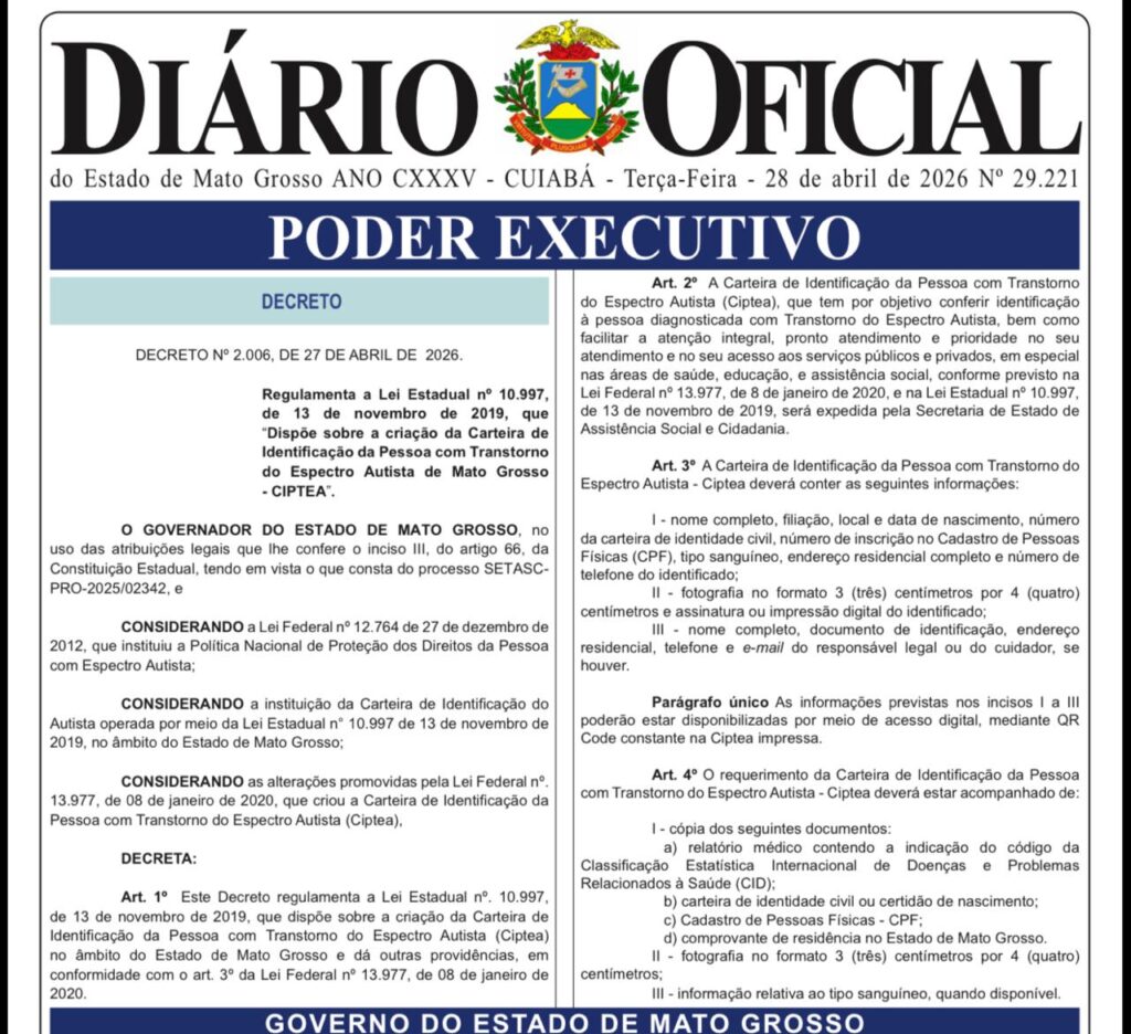 O Governo de Mato Grosso publicou o Decreto nº 2.006/2026, que regulamenta a Lei Estadual nº 10.997/2019 — de autoria do Deputado Sebastião Rezende — trazendo definições práticas e operacionais para a emissão da Carteira de Identificação da Pessoa com Transtorno do Espectro Autista (CIPTEA). A medida transforma a lei em um instrumento efetivo de política pública, detalhando como o direito será aplicado no dia a dia.