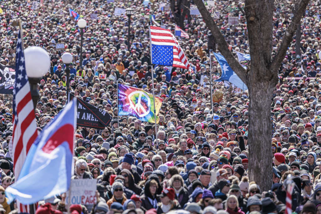 Centenas de milhares de manifestantes se reúnem em Minnesota para protestar contra Donald Trump como parte do movimento No Kings, em 28 de março de 2026