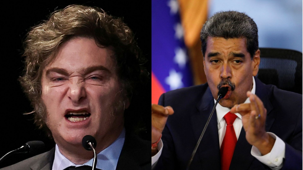 Montagem de Javier Milei (à esq), presidente da Argentina, e Nicolás Maduro, presidente da Venezuela.
