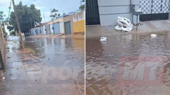 Em um vídeo enviado ao RepórterMT, a moradora mostra a rua completamente alagada, resquícios da última chuva que ainda não escoaram.