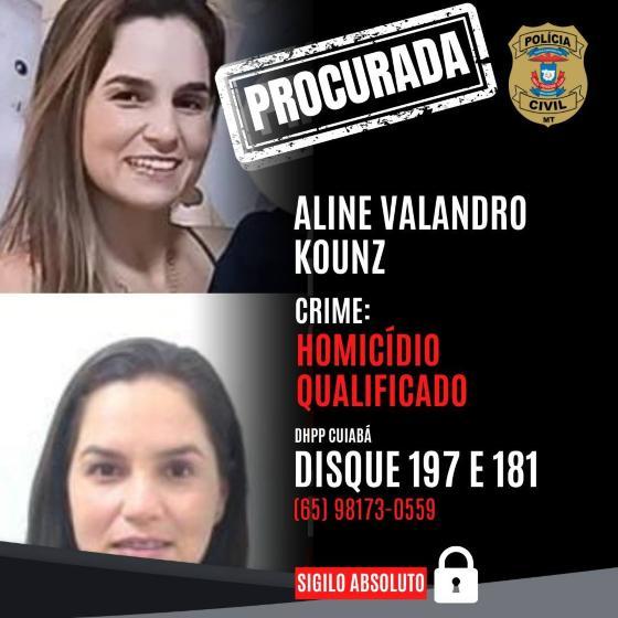 A farmacêutica Aline Valandro Kounz, esposa do soldado da Polícia Militar Raylton Duarte Mourão, segue foragida após ter a prisão temporária decretada pela Justiça por 30 dias. Ela é suspeita de envolvimento no assassinato da personal trainer Rozeli da Costa Souza Nunes, ocorrido no dia 11 de setembro, em Várzea Grande.