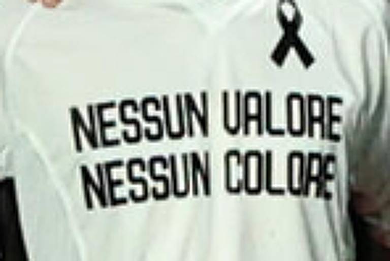 Atrás da camisa, permaneceram o nome e o número de cada atleta. Na frente, a inscrição, em italiano, “nessun valore, nessun colore”, que significa “nenhum valor, nenhuma cor”, mais a estampa de uma pequena fita preta, simbolizando luto.