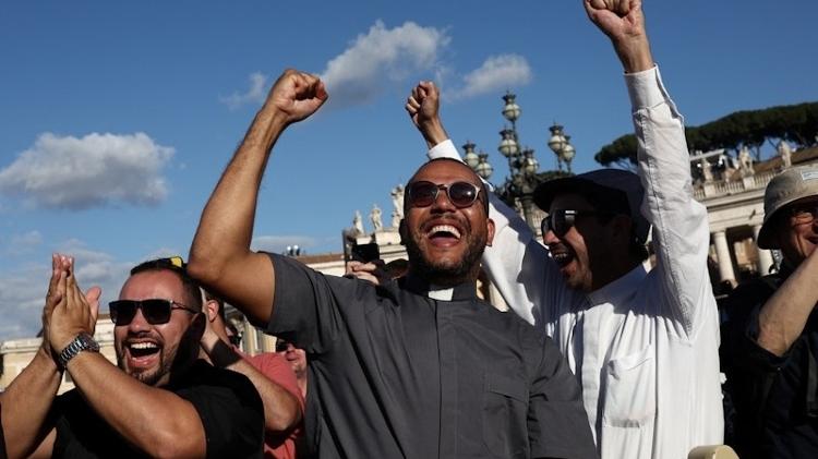 Publico comemora a escolha do novo papa em frente à Basílica Imagem: Eloisa Lopez/Reuters