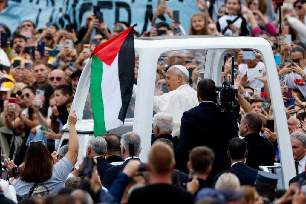 Fiel ergue bandeira da Palestina perto do papa Leão XIV durante passeio de papamóvel após missa na Praça de São Pedro, no Vaticano, em 5 de outubro de 2025.