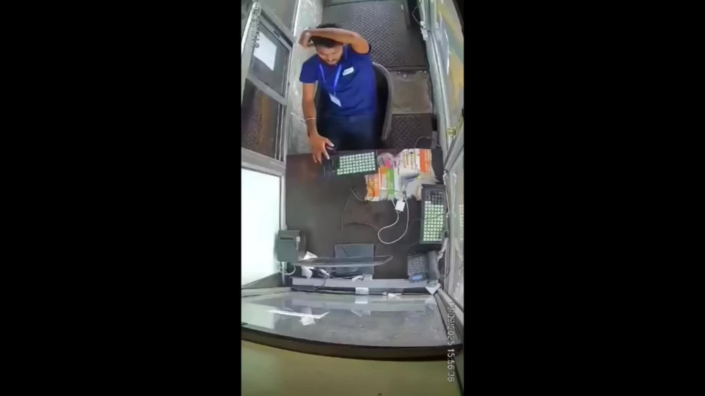 A câmera de segurança de uma cabine de pedágio na cidade de Jaipur, na Índia, registrou o momento em que um pneu de um caminhão explodiu, invadiu o lugar e atingiu um trabalhador.