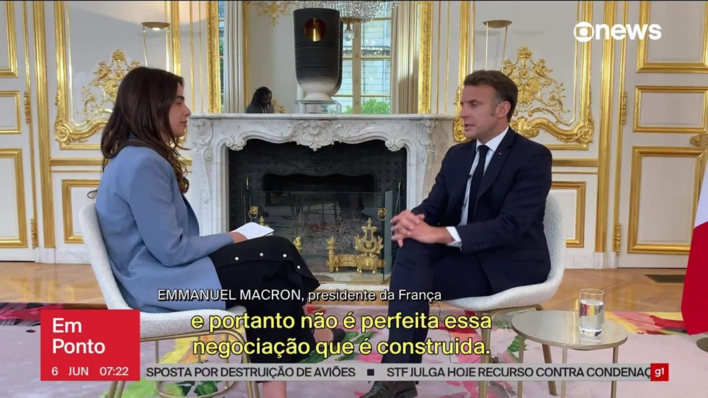 Macron concedeu entrevista exclusiva à GloboNews nesta quinta-feira (5) e citou obstáculos vistos pela França para fechar o acordo comercial entre os blocos.