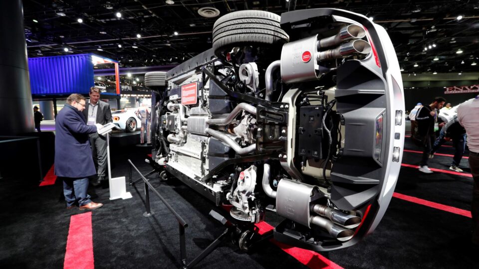 A parte inferior de Ford Mustang GT Premium conversível durante o Salão do Automóvel de Detroit 2019, em Detroit, Michigan, Estados Unidos, 15 de janeiro de 2019: a ascensão dos Estados Unidos à condição de potência industrial não se deveu às tarifas, mas ao dinamismo de seus empreendedores, à inovação, à riqueza de recursos e ao uso eficiente de capital e trabalho.
