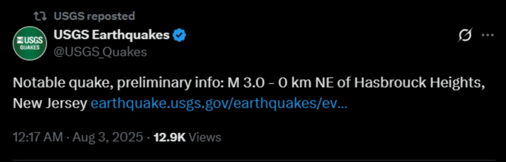 Um tremor de magnitude 3.0 foi registrado no fim da noite de sábado (2), horário local, na região metropolitana de Nova York. Segundo o Serviço Geológico dos Estados Unidos, o epicentro foi localizado em Hasbrouck Heights, no estado vizinho de Nova Jersey, a aproximadamente 10 km de profundidade.