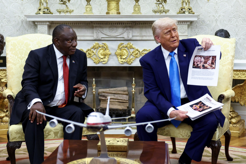 O presidente dos EUA, Donald Trump, mostra supostas reportagens sobre ‘genocídio branco’ na África do Sul enquanto se encontra com o presidente do país, Cyril Ramaphosa