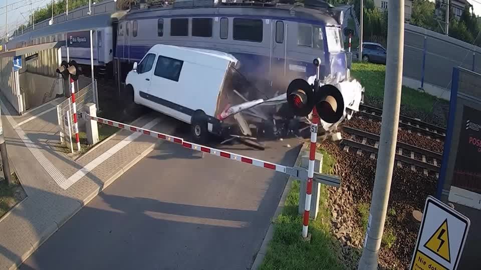 Câmera de segurança mostra van sendo destruída ao ser atropelada por trem na Polônia