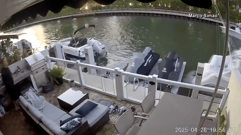 Um morador e uma câmera de segurança registraram um acidente envolvendo uma lancha em North Miami Beach, nos Estados Unidos, neste sábado (26).