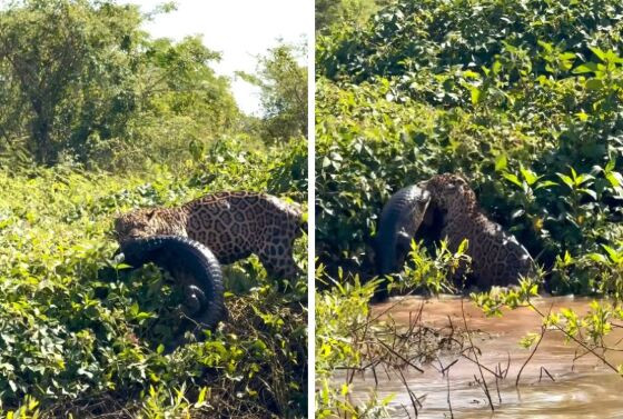 Uma onça pintada foi flagrada atacando um jacaré. O registro, compartilhado nas redes sociais pelo biólogo João Marcelo Biagini, mostra o Bororo, como é chamado o felino, se aproximando lentamente da presa.