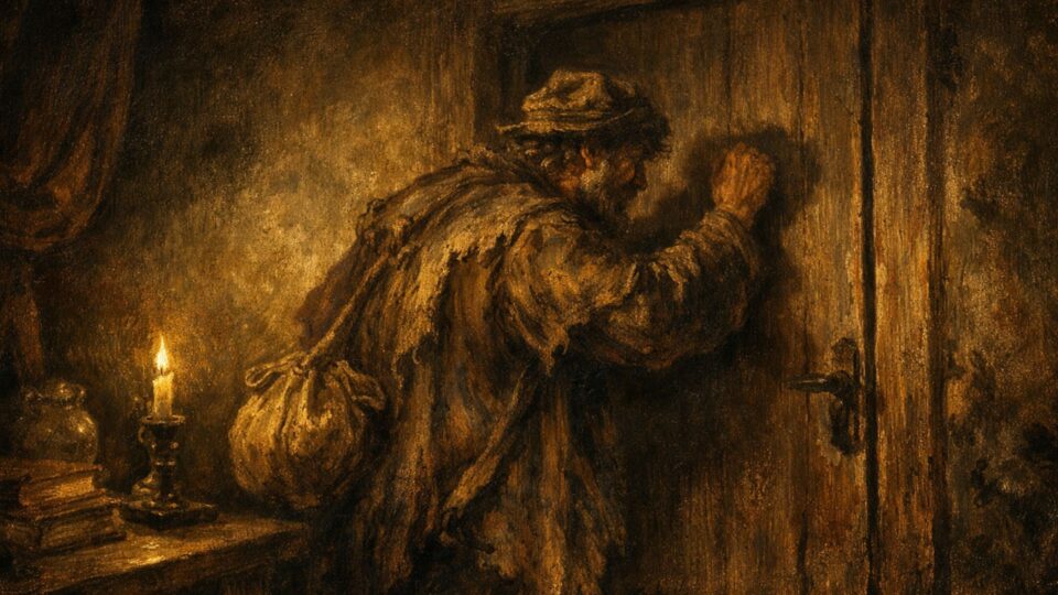 Arrastando-se até a porta, ele se pergunta se é um vizinho em pânico, uma vizinha pedindo uma xícara de açúcar – ou um bandido muito educado, que se anuncia antes de barbarizar.